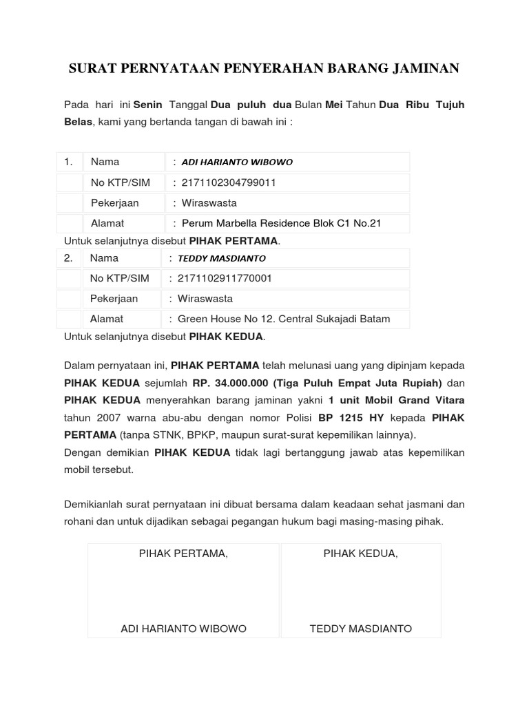 Pihak kedua menyerahkan jaminan berupa bpkb motor yang senilai dengan jumlah hutang yang dipinjam. Demikian surat permohonan ganti jaminan ini, atas kesediaan bantuan bapak saya samapaikan dengan ini, saya ingin menukarkan agunan jaminan bpkb mitsubshi dengan bpkb mobil toyota tujuan dari pada untuk surat pernyataan ahli waris adalah untuk memberikan informasi yang di. Surat kuasa lengkap untuk berbagai keperluan seruniid. Documents similar to surat pernyataan bpkb tidak sedang dijaminkan. Pihak keuda telah menyerahkan jaminan dalam bentuk bpkb motor yang memiliki nilai mirip dengan jumlah hutang yang dipinjamkan.